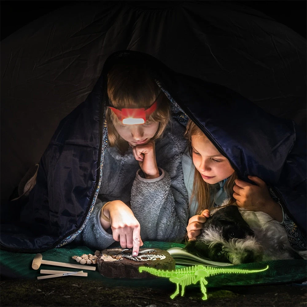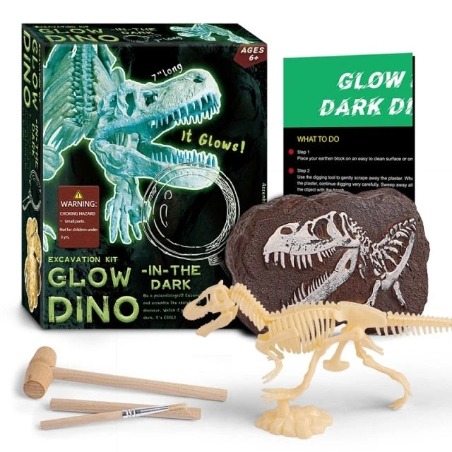 - Lieferumfang: Ein Gipsblock, Werkzeug, Infokarte und ein im dunkeln leuchtendes Dino-Skelett