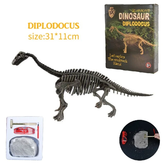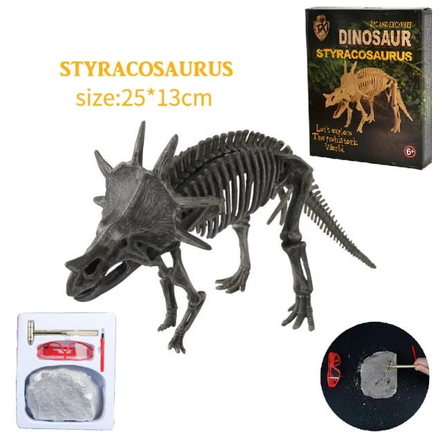 Mit diesen unterschiedlichen Dinosaurierskeletten können ihre Kinder spielerisch die Dinosaurierwelt kennenlernen. Doch bevor die Dinosaurier Fossilien zum Vorschein kommen müssen diese zunächst, wie im echten Leben ausgegraben werden, denn die Fossilien befinden sich in einem Stein. Insgesamt gibt es 8 Dinosaurier zur Auswahl. So kann beispielsweise das Fossil des bekannten Dinosauriers Tyrannosaurus Rex ausgegraben werden.
