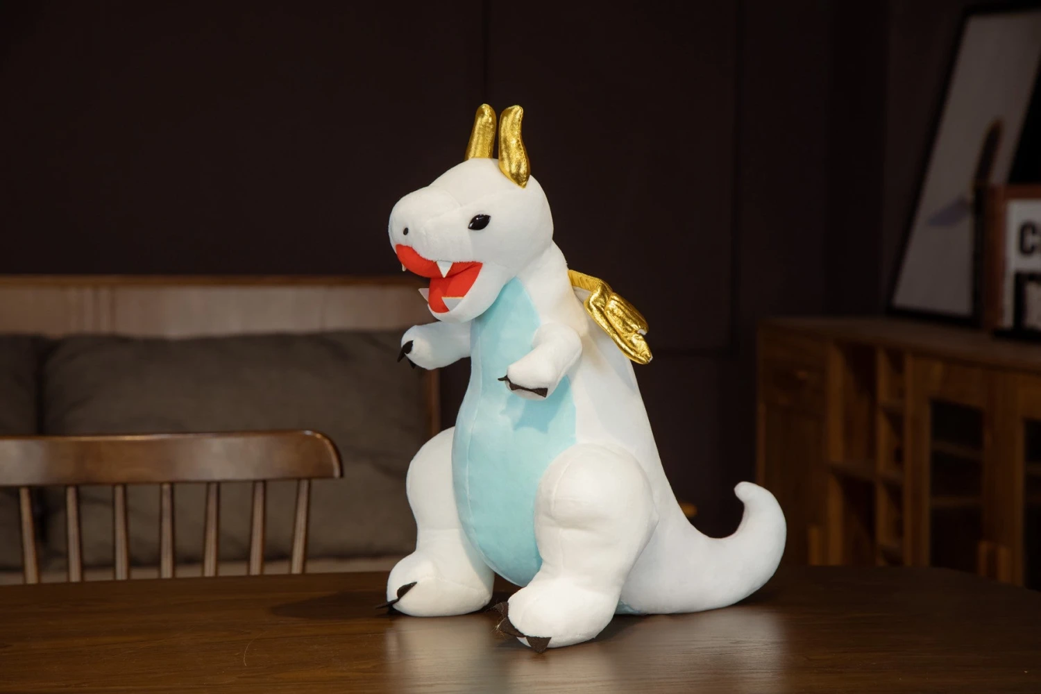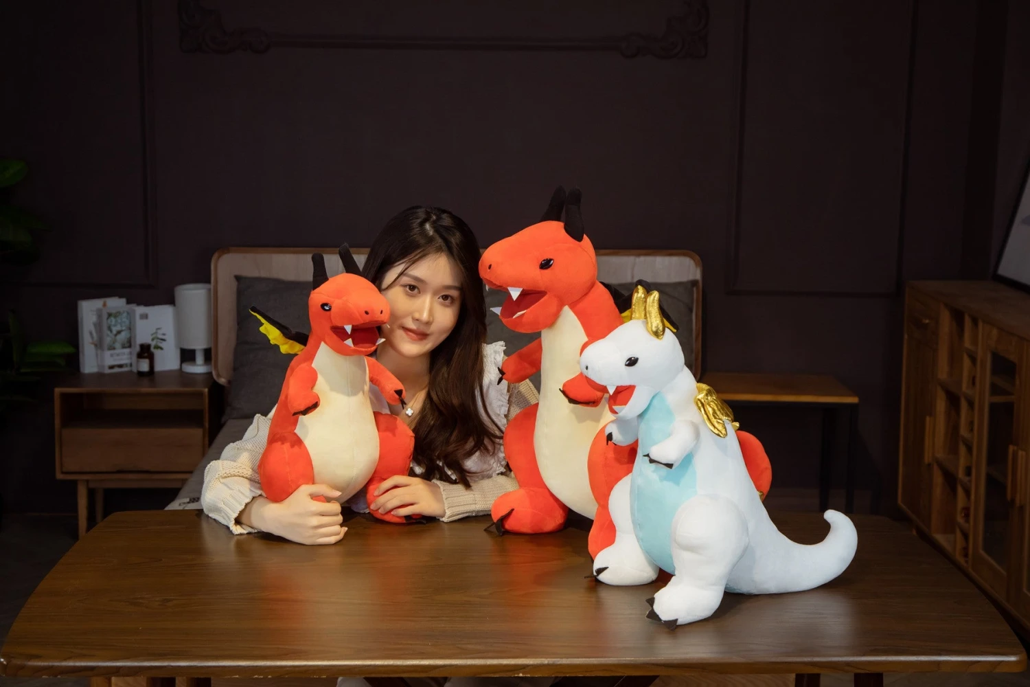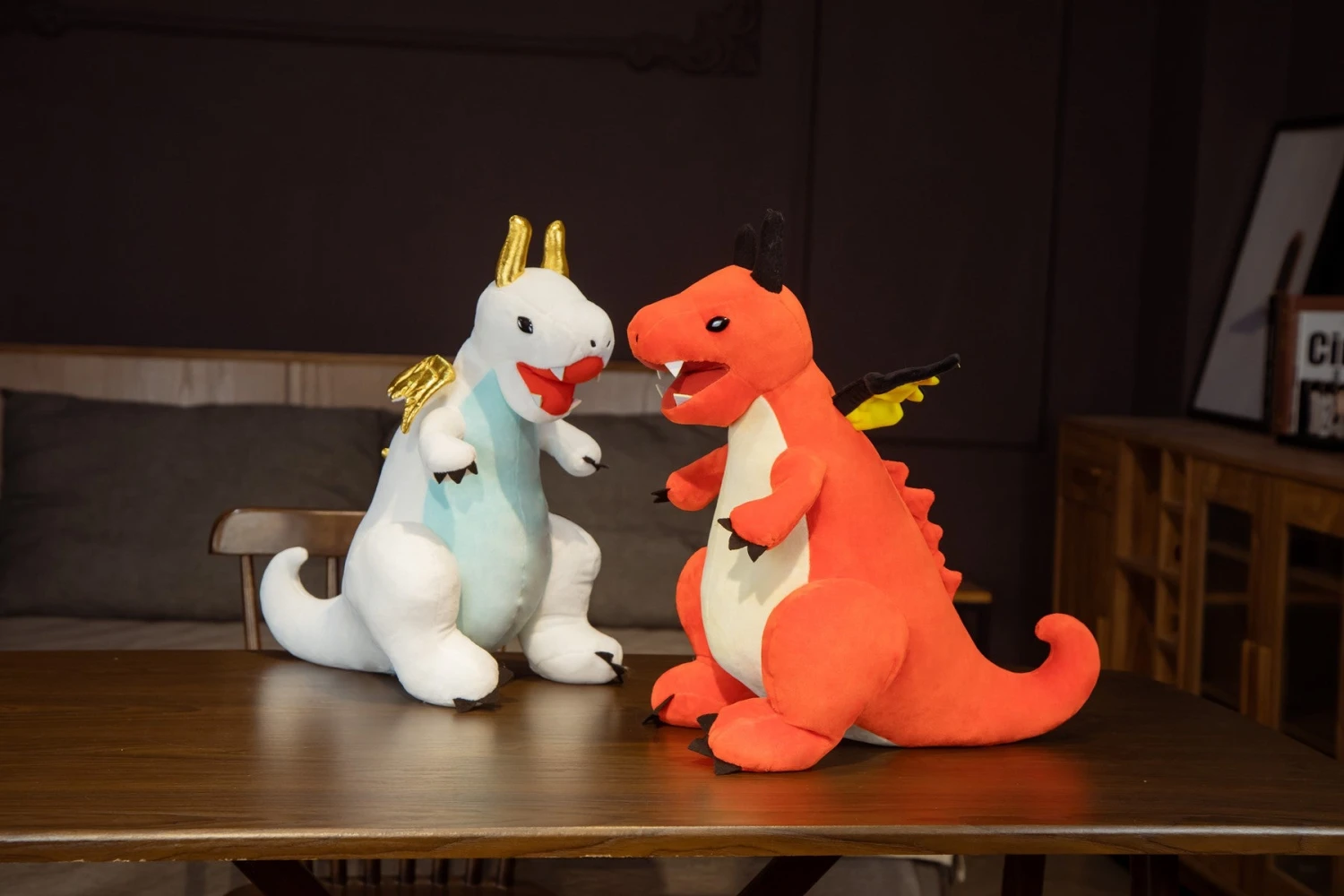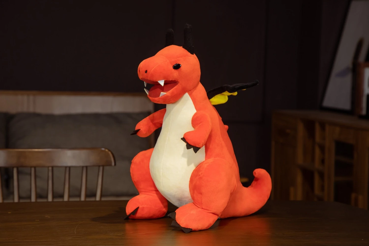 Das Kuscheltier gibt es in den Farben Rot-Orange und Blau. Es ist aus Plüschmaterial hergestellt worden und damit super weich und eignet sich damit perfekt zum Kuscheln und Schmusen für Kinder.