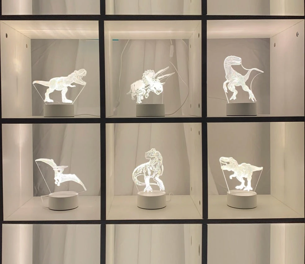 Diese Lampen sind genau das Richtige für Fans von Dinosauriern. Auf einem kleinen Sockel sind die Konturen verschiedenster Dinos zu sehen. Sobald man das Licht einschaltet, erstrahlen die Konturen und erzeugen einen 3D Effekt, sodass die Dinos wortwörtlich zum Leben erwecken. Mit insgesamt 19 Dino Motiven habt ihr genügend Auswahl den für euch passenden Dino auszuwählen. Zahlreiche Dinosaurier, welche man aus Action- oder Zeichentrickfilmen kennt, sind selbstverständlich auch dabei.