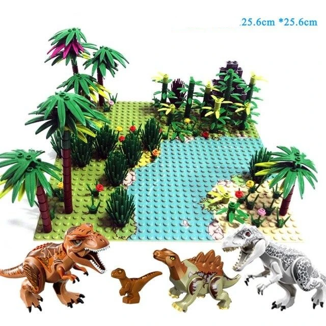 Dinosaurier Spielzeug Set mit 4 Dinos und Bodenplatte inkl. Bausteinen. Mit diesem Set steht dem nächsten Abenteuer im Kinderzimmer nichts mehr im Wege.