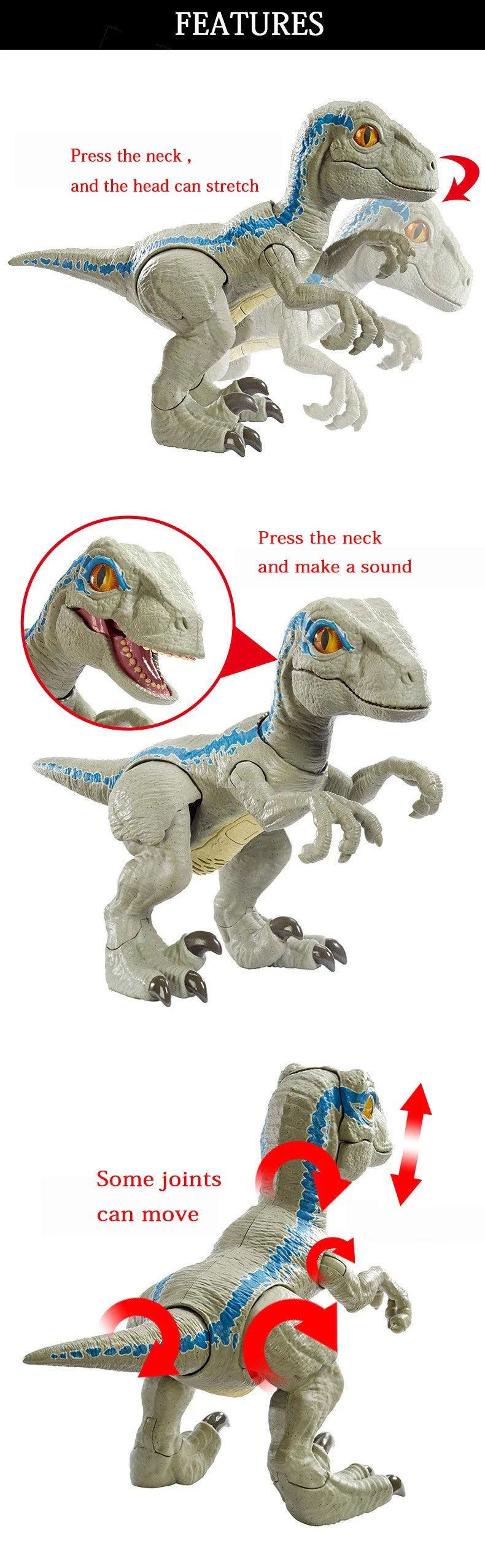 - Die Dinofreundin Blue wird mit einem Druck auf den Knopf auf ihrem Rücken zum Leben – dadurch werden ihre realistischen Bewegungen aktiviert: sie kann hin und her wackeln, ihren Hals und Rumpf drehen und ihren Kiefer, begleitet von Geräuscheffekten aus dem Film, öffnen und schließen