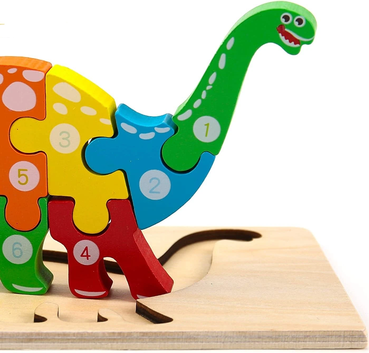 Mit dem Holzpuzzle lernen Kinder nicht nur Formen und Farben, sondern auch die Zahlen von 1 bis 10. Die Puzzleteile können zudem in die Holzform gelegt, aber auch stehend zusammen gesteckt werden, so dass der Dino eine 3D-Form annimmt.