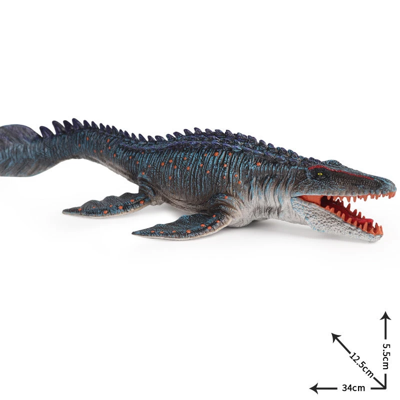 Dieser Dino war einer der größten Reptilien zu Dinozeiten und lebte in den Tiefen des Meeres. Der Dino trägt den Namen Mosasaurus und hat eine ähnliche Form, wie die eines Krokodils. Er ist somit ein Schwimm- und Kriechreptil. Der Dino hatte eine blaufarbige Schuppenhaut mit vereinzelten orangenen Punkten darauf. Es gab auch Mosasaurus, welche eine grüne Haut hatten. Die Mosasaurus Dino Figur haben wir in beiden Ausführungen für euch.