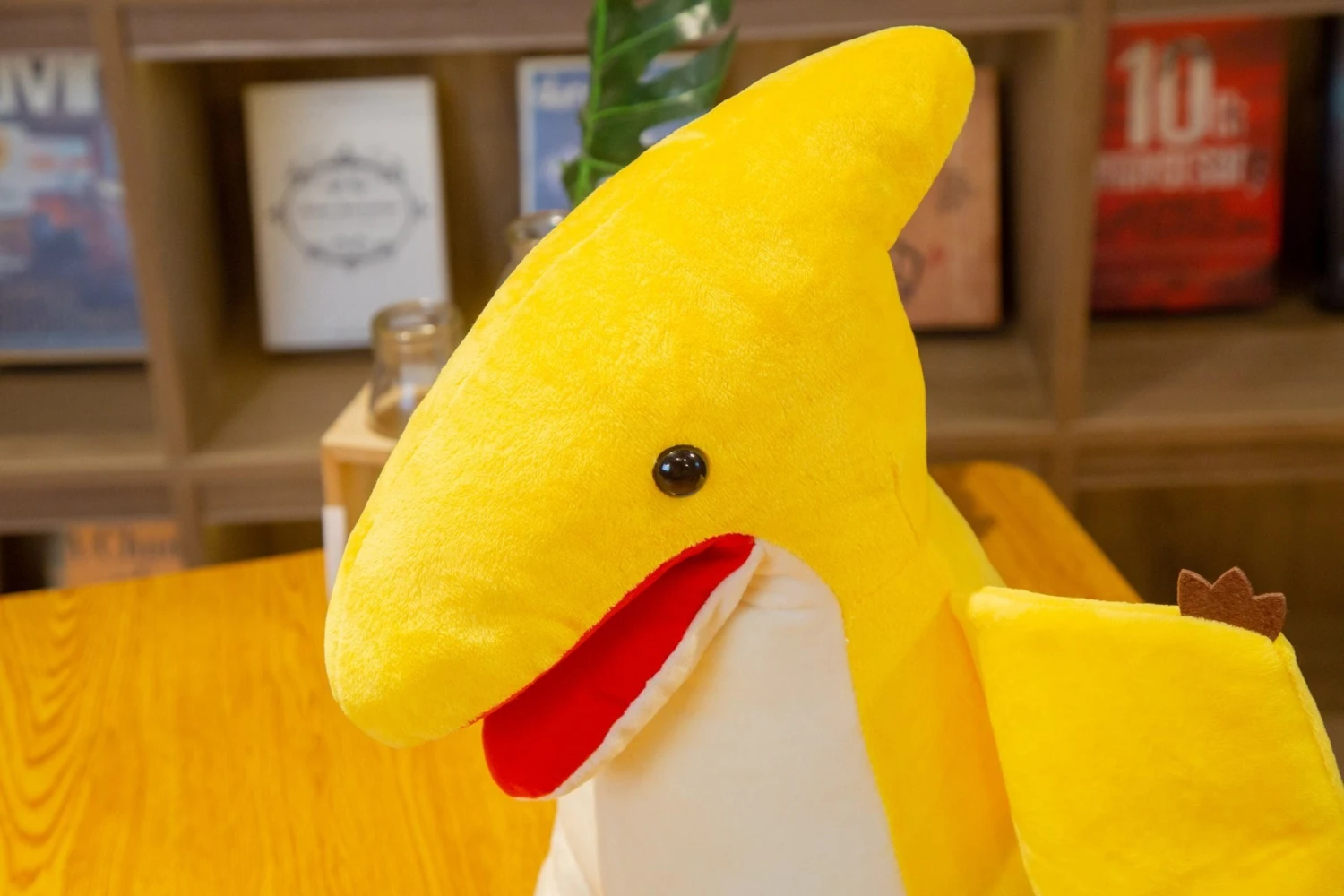Fossilien des Pterodactylus hat man in Bayern (Deutschland) gefunden, aber auch in England und Tansania. Der fleischfressende Flugsaurier lebte während des Jura, sein Name bedeutet auf Altgriechisch so viel wie „Flügelfinger“. Und genau dieses Detail wurde bei diesen kuscheligen Plüschtieren auch umgesetzt: Kleine braune Filzkrallen an den leuchtend gelben Flügeln der Kuscheltiere verweisen auf den Namensursprung.