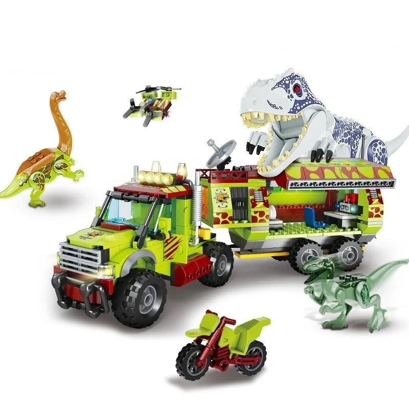 T-Rex Dinosaurier mit LKW Baustein Set (538 Teile). Begleite das Jurassic Expeditions Team auf ihrer Mission durch den Dschungel und spiele die Abenteuer der Filme nach.